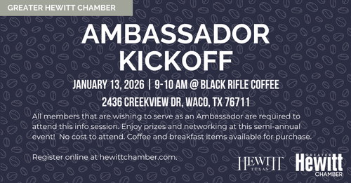 Join us for our ambassador kickoff. All members wishing to serve as an Ambassador are required to attend. Enjoy networking, door prizes and lots of information at this semi-annual event.