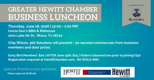 Join us for our business networking luncheon! Chip Wilson, 360 Solutions, will present.