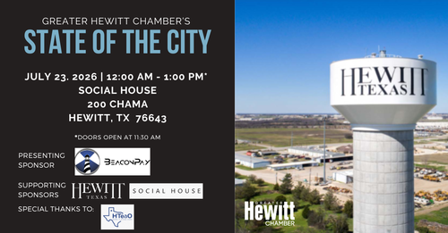 Join us for this very informative luncheon including reports from City of Hewitt officials with a Q&A at the end of the panel. Great networking opportunity, with 30 second commercials at the end and time to network! Special thanks to BeaconPay Solutions for presenting.