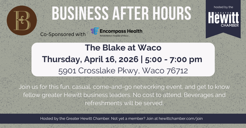 Join us for a Business After Hours event at The Blake of Waco. This is a casual, come and go networking event. Free to attend. Refreshments provided