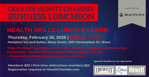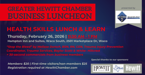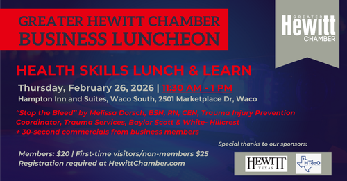 Join us for this hands-on lunch and learn led by Melissa Dorsch and her team from BSW Hillcrest Trauma Services. The program will cover stop the bleed skills, basic CPR (chest compressions only) and tips for treating heat exhaustion. We’ll have 30-second commercials from business members after the program.