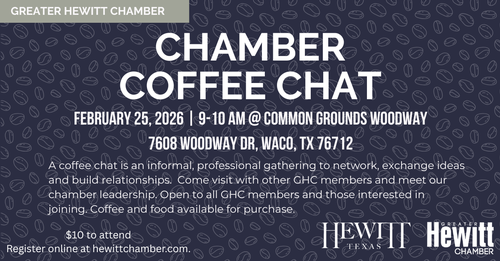 A coffee chat is an informal, professional gathering to network, exchange ideas and build relationships. Come visit with other chamber members and meet our chamber leadership. Open to all GHC members and those interested in joining. Coffee and Food available for purchase. $10 to attend, please register!