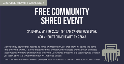 Have a lot of papers that need to be shred and recycled? Just drop them off during this come-and-go event, and HOT Shred will take care of it! Notarized certificate of destruction available upon request from the chamber after the event. Documents are taken to a secure offsite location for destruction. No shredding onsite! NO batteries please.
