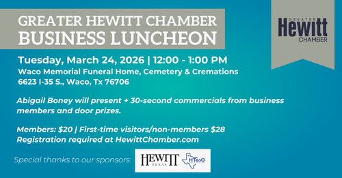 Join us for our monthly business networking luncheon. Abigail Boney from Waco Memorial Park will present.